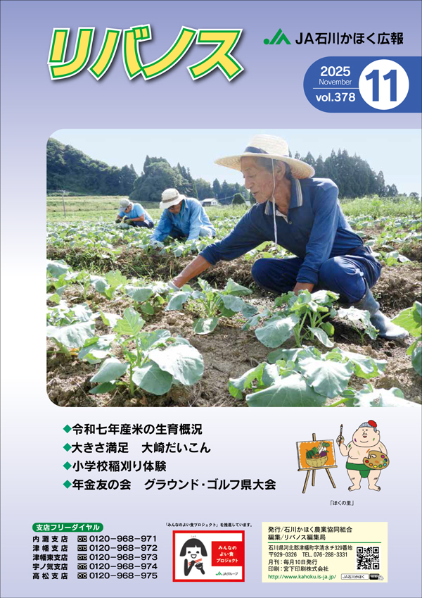 ・令和七年産米の生育概況 ・大きさ満足 大崎だいこん ・小学校稲刈り体験 ・年金友の会 グラウンド・ゴルフ県大会