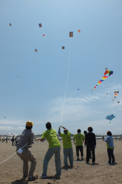 参加。参加者はさわやかな初夏の浜風を感じがら、凧あげを楽しみました。