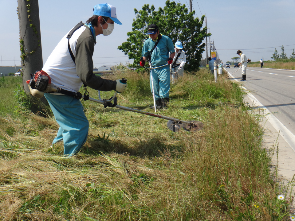 当JAを含むグリーン・アース農地・水・環境保全組織13団体をはじめ、関係行政機関、干拓地生産農家、民間企業などから約250人が参加し、5月30日、河北潟干拓地中央幹線道路沿いの防風林帯の一斉除草・清掃を行いました。参加者は作業場の注意点について説明を受けた後、それぞれの担当に分かれ作業をスタート。草刈機を使い雑草を刈り取ったり、空き缶やペットボトルなど捨てられているゴミを拾い集めたりと、強い日差しが照りつける中、休憩を交え約2時間、作業に汗を流しました。