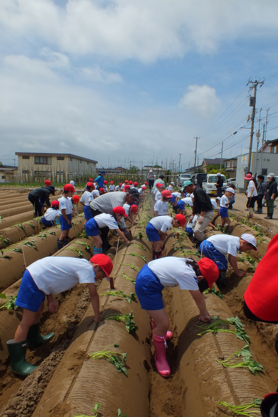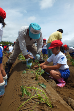 児童は同組合の生産者や関係者に直接植え方を教わりながら、根が出る部分をしっかり土に埋め、「かほっくりができるのが楽しみ」などと、秋の収穫を心待ちにしていました。