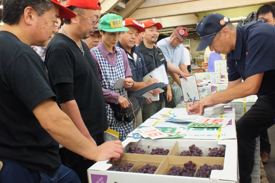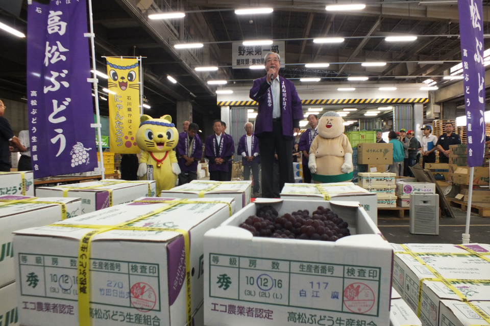金沢市中央卸売市場で6月22日、前日出荷が始まったデラウエアの初競りが行われ、1箱2,400~3,000円で競り落とされました。競り開始前には、油野和一郎かほく市長や当JAの種本博代表理事専務がトップセールスを行いました。