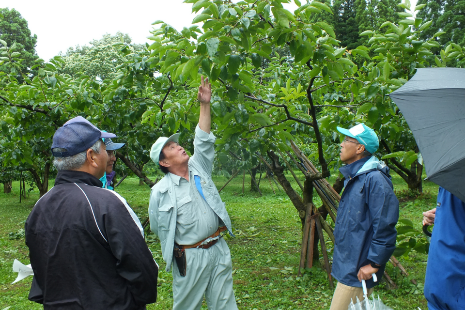 かほく市高松地区の3ヵ所の柿団地で6月17日、かほく市特産の柿「紋平」の摘果講習会が開かれ、生産者・関係者合わせて約40人が参加しました。摘果作業は果実を小さいうちに間引く作業で、果実肥大の促進や玉ぞろいを良くするだけでなく、木の負担を減らし、翌年の結実不足を防ぐ重要な作業です。