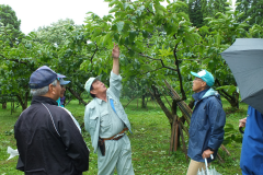 今年は着果量が多くなっている園が多いこともあり、生産者は実際に木を見ながら摘果のポイントを確かめていました。また、今後の管理として、夏場の日焼け対策や病害虫の防除などに、より一層注意するよう呼びかけがありました。