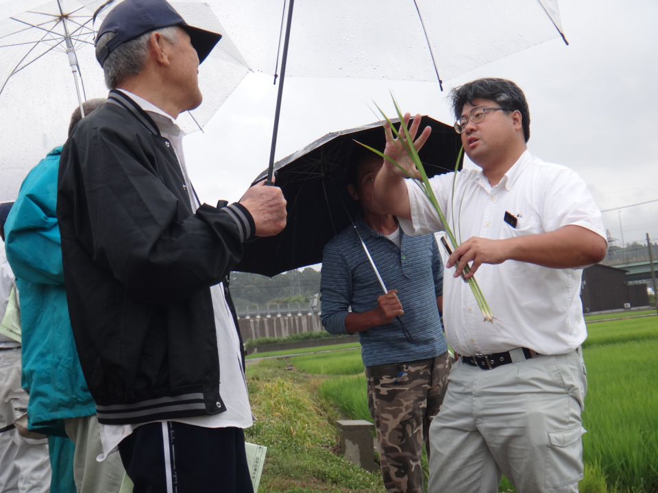 7月7日から4日間、当JA管内45ヵ所でコシヒカリの青田研修会が開かれ、各地区から多くの生産者が参加しました。研修会では営農指導員から、穂肥は生育状況を確認し、適期・適量を心がけること、気象条件にあった水の管理を行うことなど呼びかけがありました。また、飛翔性の高いカメムシが多く確認されており、カメムシ対策として畦畔・農道の除草を行うことなど指導がありました。