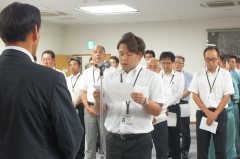 当JAは9月1日、本店で平成27年度秋の交通安全運動「JA共済交通安全旗リレーの出発式」を開き、出席した役職員約60人が一丸となった交通安全への取り組みを誓いました。式では井上信一代表理事組合長が「JA共済に携わるものとして事故防止に努め、交通安全の模範になっていきたい」とあいさつ。 津幡警察署の杉森光弘交通課長から、県内と当JA管内における交通事故状況と安全確認を徹底するよう呼びかけがありました。