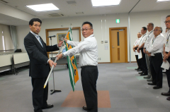 職員を代表して津幡支店の加賀谷卓也さんが「命の尊さと交通事故の悲惨さを深く認識し、事故の防止・抑止に努めたい」等と交通安全運動重点6項目を力強く宣誓。井上組合長から山下光晃高松支店長に安全旗が手渡され、役職員は事故防止へ気持ちを新たにしました。