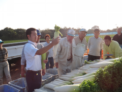初出荷を前に、同組合の小村悟組合長の畑で目合わせ会が開かれ、生産者・関係者約20人が早朝に収穫した大根「夏つかさ」を手に取り、出荷時の注意点や選別基準、等級・階級の各区分を確認しました。