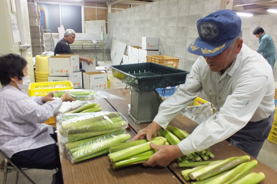 当日は、同組合の組合員6人が集荷したマコモタケを規格や等級ごとに選別。袋に入れ、箱詰め作業を行いました。