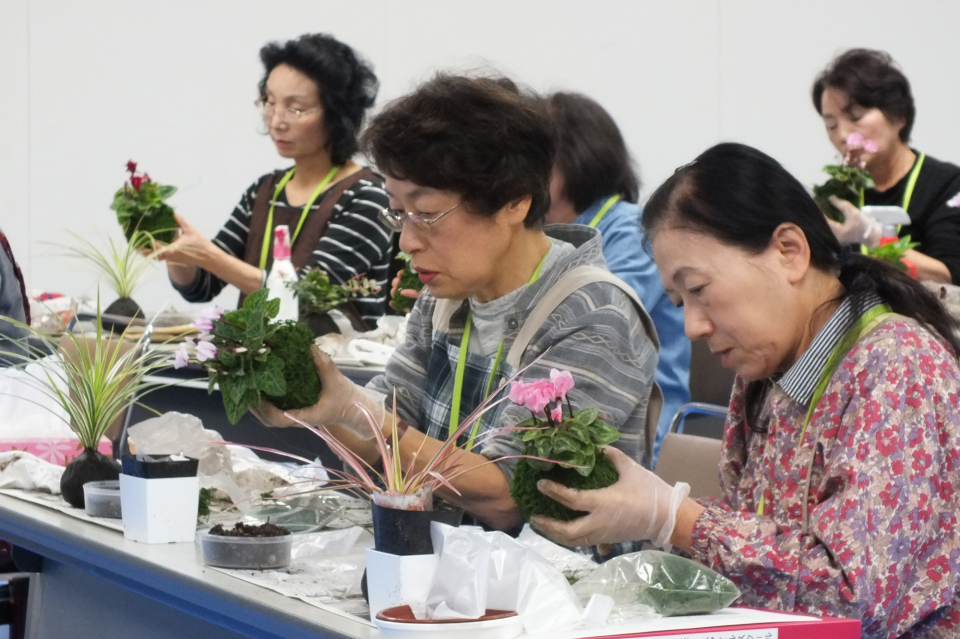 作業では5種類の観葉植物の中から1つと、ガーデンシクラメンを各自で選び、植物の大きさに合わせ、けと土とこけを糸で巻きつけました。途中、ガーデンシクラメンを長く保つ方法を教わったほか、けと土が乾燥するため注意するよう指導がありました。