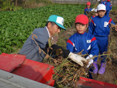 かほく市立大海小学校3年生児童14人は10月23日、5月に種をまき、6月に土寄せ作業を行ったかほく市瀬戸町の畑で、大豆「エンレイ」の脱穀作業を体験しました。児童らは圃場主の髙﨑武義さん・政勝さん兄弟に教わりながら、事前に刈り取った大豆の茎を寄せ集め、3~4本を束にして脱穀機まで運びました。次々と大豆のついた茎を吸い込んでいく脱穀機の速さに、児童は驚きの表情を見せていました。