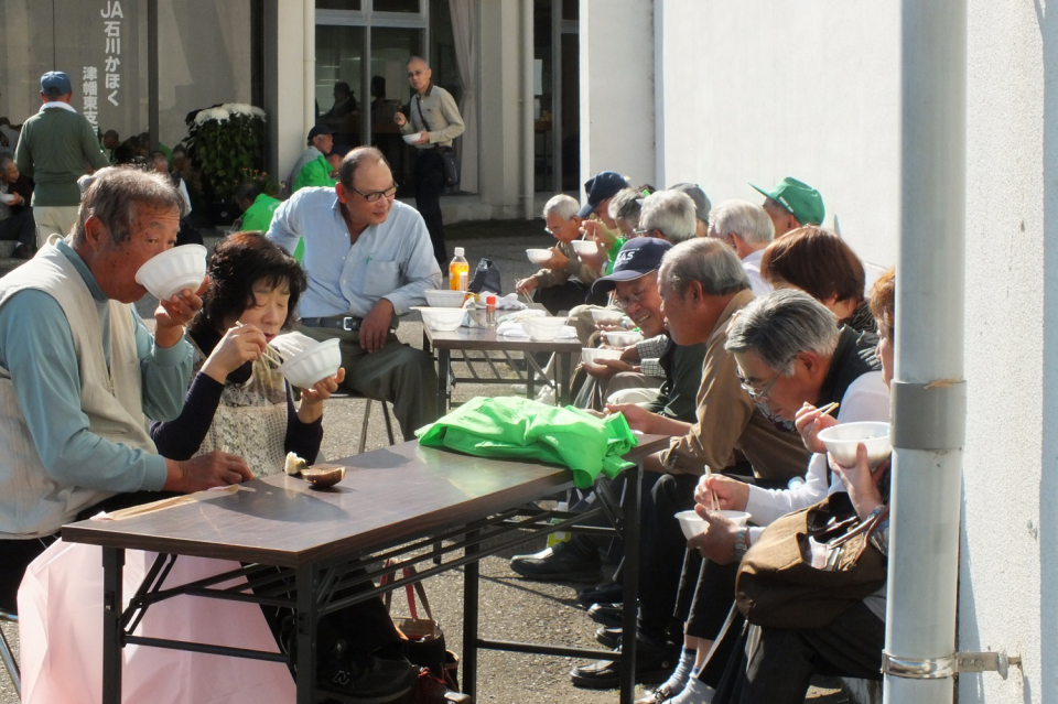 ふるまい鍋では、昨年に引き続きいも鍋を約200食用意。JAグリーンかほく産直部会会員が栽培する野菜や同委員らが育てたサトイモなどを使い、しょうゆをベースに大きめに切った野菜が存在感を出していました。委員らがサトイモや野菜がたっぷり入った椀を来店者に手渡すと、早速アツアツのいも鍋を堪能し、中にはおかわりをする人もいました。