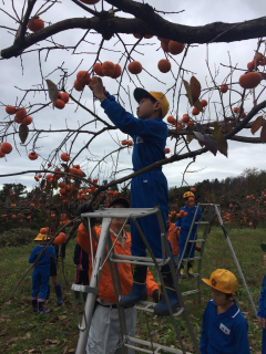 高松紋平柿生産組合は11月16日、かほく市内6校の小学3年生児童320人を対象に、同市瀬戸町の圃場でかほく市特産「高松紋平」の収穫体験を行いました。同組合の岩野伸一組合長から、紋平柿や作業の流れ、アルコール脱渋について説明があり、児童は真剣に話を聞いていました。