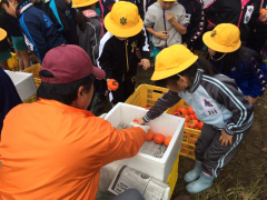 児童は、木にたくさん実った柿を吟味しハサミで1人2~3個収穫。自分たちが収穫した柿を使って、今度は渋抜きを体験。生産者指導の下、児童は発泡スチロールの箱に紋平柿をきれいに並べ、その上に新聞紙を置き、さらに脱渋用のアルコールを含ませた脱脂綿をおいてガムテープで密封しました。果実の渋が抜けるまでに約1週間かかるため、児童はそれぞれの学校に持ち帰り開封を心待ちにしていました。