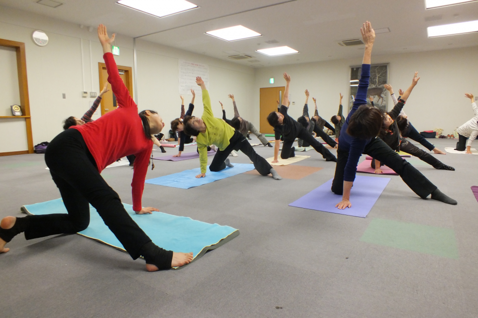 受講生はゆったりとした音楽に合わせ、自然体で深い呼吸を意識しながらさまざまなポーズを実践しました。