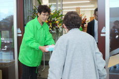 関係者がテープカットの後、同支店活性化委員らが来店者に新築記念品を配布しました。