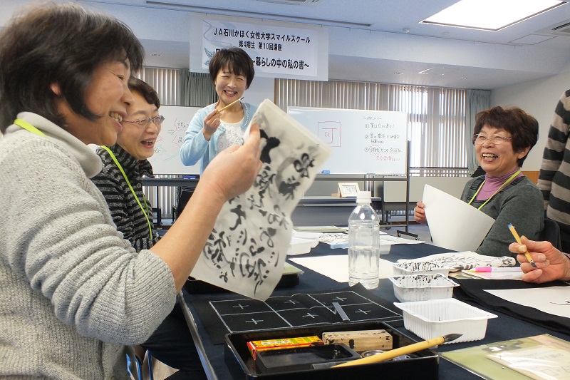 4期受講生29人は12月9日、当JA本店で第10回講座に出席し、最近あまり使わなくなってきた筆と墨で自由に文字を書きました。講師の数馬陽舟さんから、遊び字(アート)で楽しく自分らしい文字を書くことを学び、重要ポイントとして筆を立てて書くことや墨の濃淡、にじみ具合を確かめることなどを習いました。