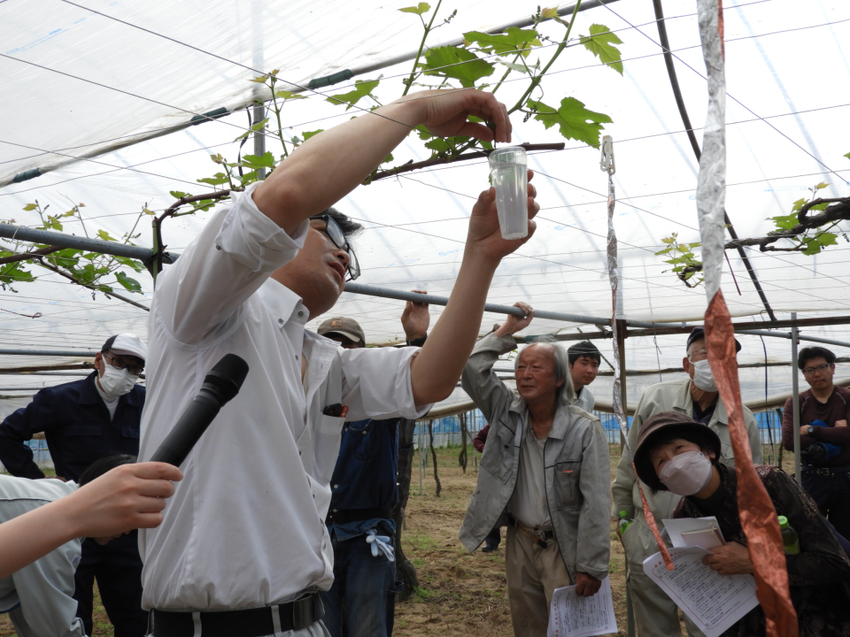 県央農林総合事務所職員から県内ぶどうの生育状況についての報告後、砂丘地農業研究センター職員からジベレリン処理等の今後の管理について説明がありました。