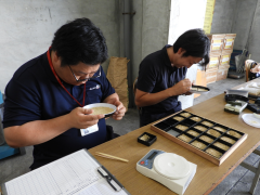 検査員が袋からサンプルを採取し、粒の色や大きさ、水分量などを入念に検査。1等米比率は約70パーセントとなりました。