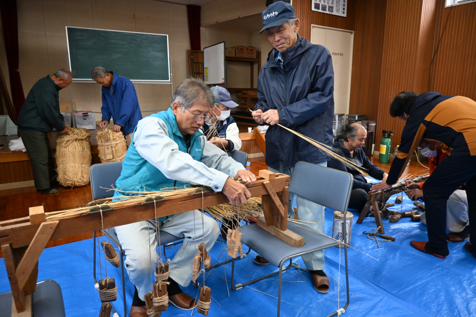 11月1日、かほく市の指江公民館にて同地区で藩政期から続く伝統行事「盤持大会」で使用する米俵づくりを行いました。