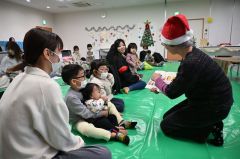 絵本「さんかくサンタ」には、車や人形など子どもたちが喜ぶプレゼントの絵がたくさん描かれ、目を輝かせていました。リズムに合わせて動く手遊び歌は、親子で一緒に手や足を動かして楽しみました。