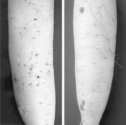 乾燥は根の肥大を妨げ、肉質を硬化し、苦味・辛味を生ずるなど品質を悪くします。とくに、ホウ素の吸収阻害(欠乏症)を起しやすいので、適湿に管理するか、ホウ素入りの肥料を用いることです。