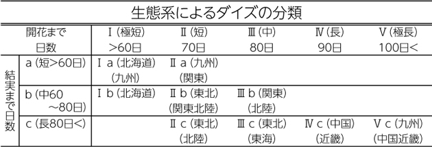 夏大豆、秋大豆を熟期の早晩で、早生(わせ)、中生(なかて)、晩生(おくて)に分けます。地域(寒地、寒冷地、温暖地、暖地)によって適応する品種は違います。