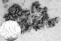 庭先などで、雨上がりにキクラゲのような姿をし、乾燥すると地表に黒いかさぶたのようにへばりつき、気味悪がられる物体です。この正体は、藍藻の1種でイシクラゲ(石水母)と言います。寒天質の基質の中に数珠状に細胞が連なった細胞糸が埋もれています。乾燥耐性が強く何十年も乾燥状態で休眠できます。