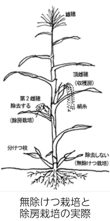除けつをしないで分けつを残す(無除けつ栽培)と、根量や葉面積が増えて、雌穂の肥大が良く、先端部分の不稔が少なくなります。品質向上と増収が期待できるとともに、倒伏防止の効果も得られ、省力にもなります。