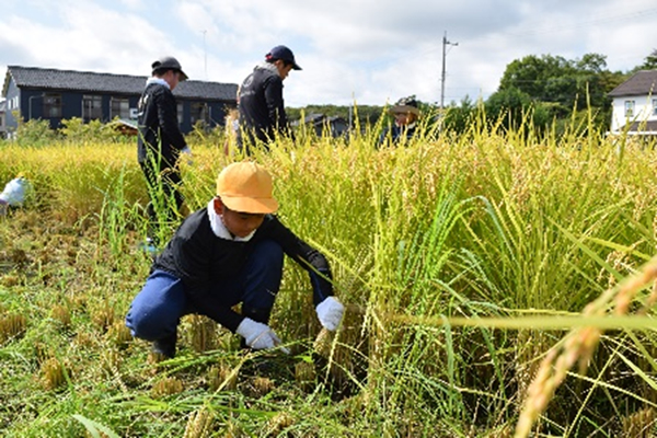 農事組合法人たなかふぁーむの田んぼで5月に植えた「ひゃくまん穀」の稲刈りを体験しました。田中哲さんに刈り方を習い、鎌を使って刈り取りやハザ干し作業もしました。児童は「稲を刈るのは思ったより力がいる。稲をひねって束ねるのが難しい」と汗だくで作業しました。