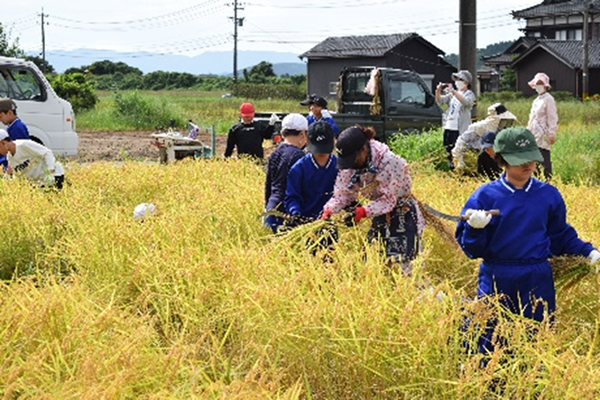 農家の澤井智文さんや能登部下地区の方、協力のもと、学校近くの田んぼで「コシヒカリ」の稲刈りを体験しました。刈り取った稲はワラを使って束ねる作業も行いました。