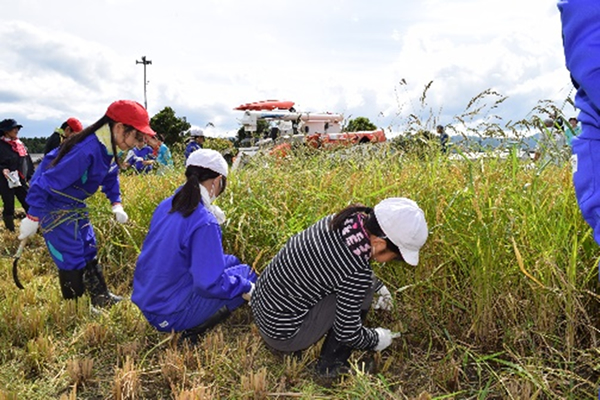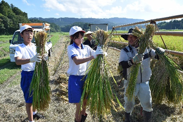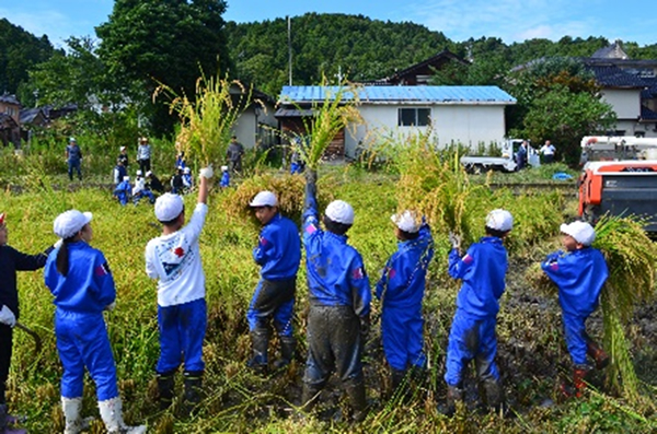 白馬雄晴さんが管理した田んぼで「コシヒカリ」の稲刈りを体験しました。児童は「稲をしっかりつかまないとバラバラになって切りにくかった」「暑い中大変な仕事だと知り、これからはもっとおいしくご飯が食べられる」と話していました。