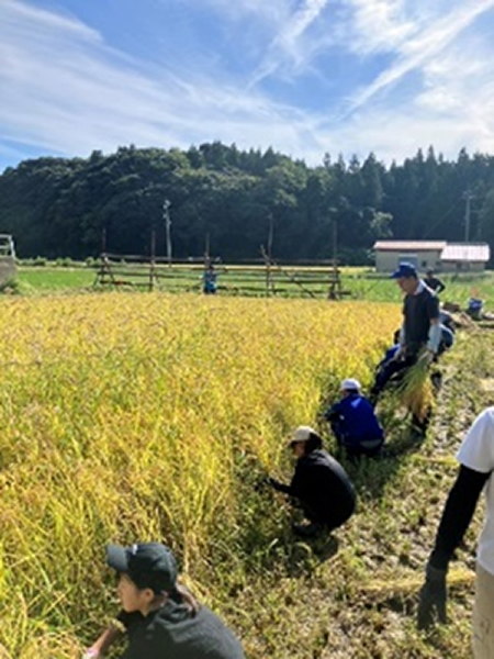 農家の高橋正俊さんが管理した田んぼで5月に植えた「コシヒカリ」の稲刈りを体験しました。刈り取った稲はハザ干ししました。