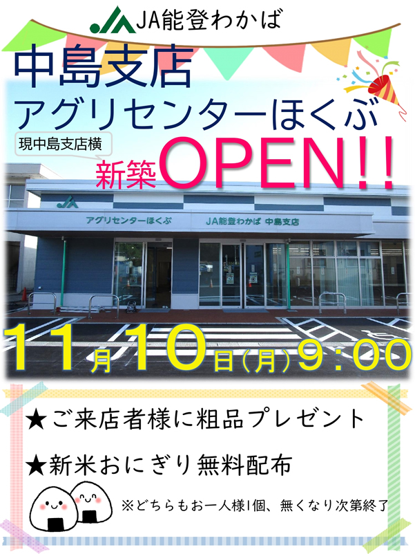 11月10日(月)中島支店・アグリセンターほくぶが、現中島支店横に移転し、新築オープンいたします。