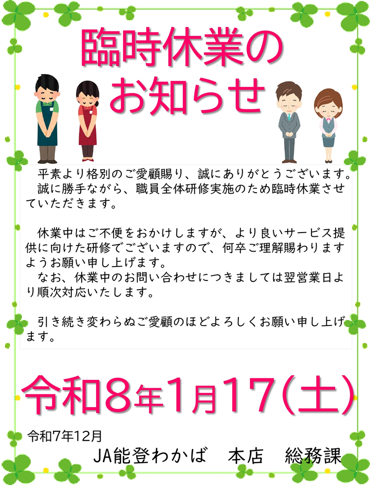 平素よりJA能登わかばをご利用いただき、誠にありがとうございます。