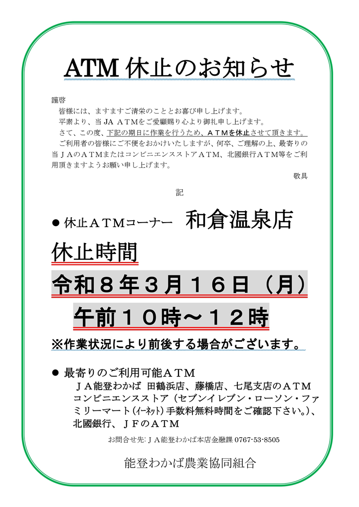 3月16日に和倉温泉店ATM休止いたします